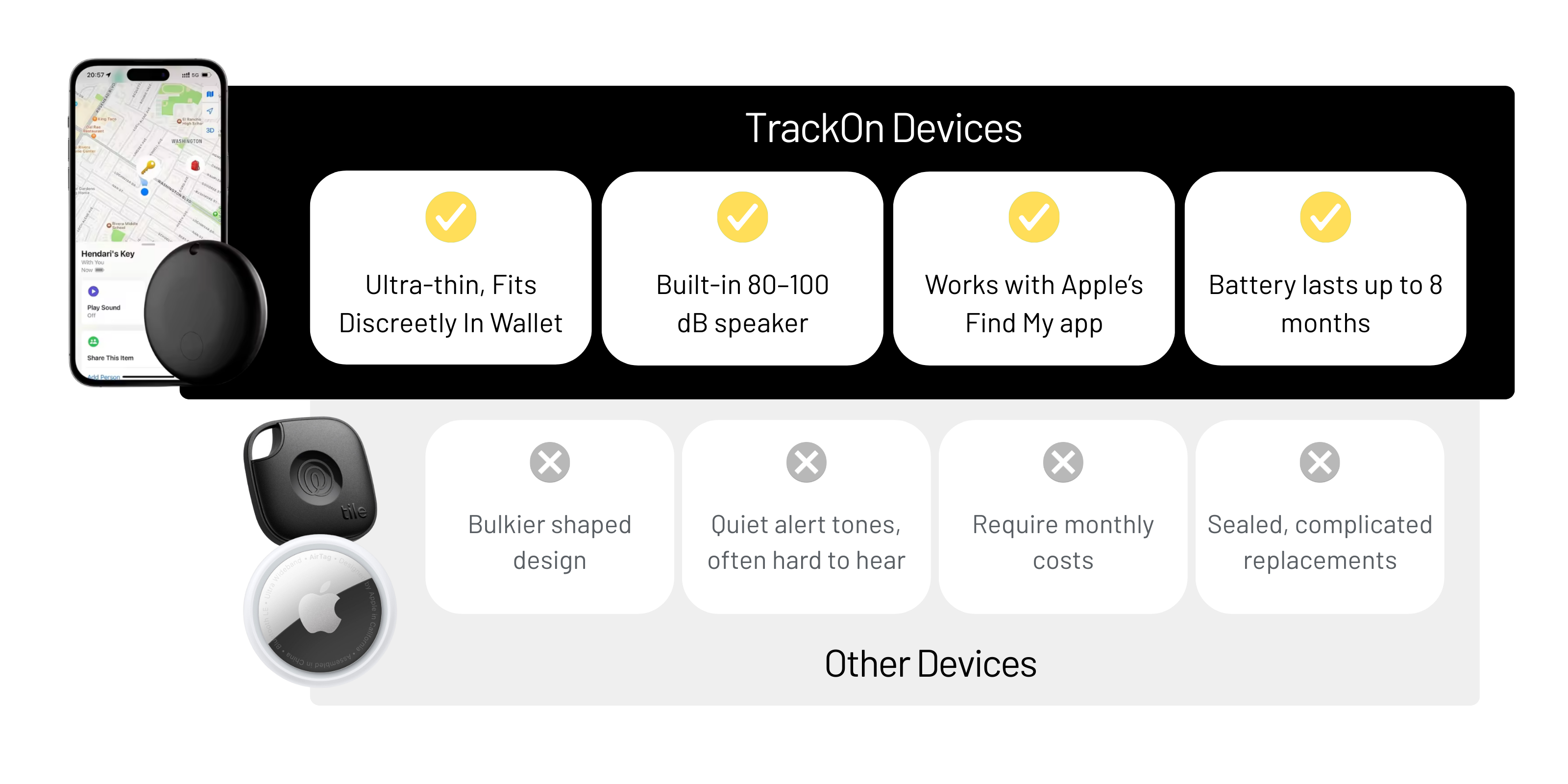Our tracker is slimmer, louder, and more versatile than an AirTag. It fits better in wallets and luggage, has an 80β100 dB speaker (making it easier to hear), and offers the same Find My network features without the premium price tag.